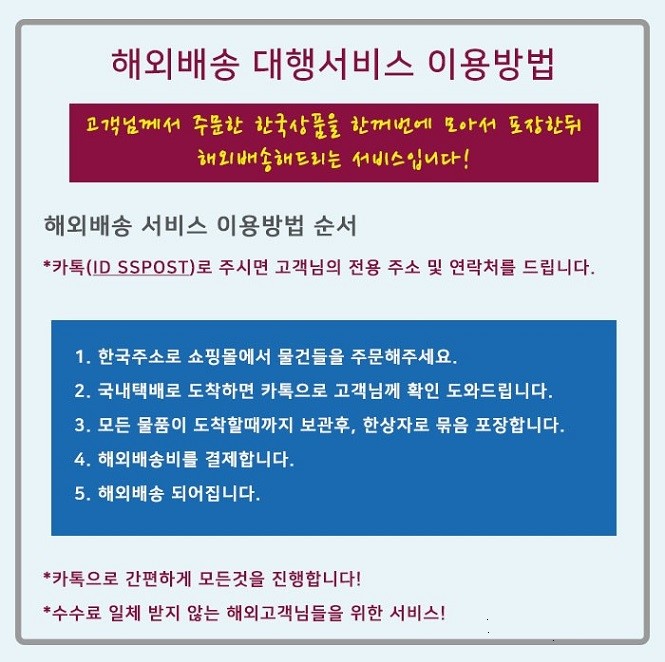 이용방법은 정말 간편합니다. 우선 카카오톡으로 "SSPOST"를 친구추가해주시고 안내받으신 주소지로 쇼핑몰에서 물품을 구매후 보내주시면됩니다. 물품이 도착하면 배송팀에서 카카오톡으로 확인시켜드리고 모든 물품이 도착하면 무료로 합포장하여 보내드립니다.
