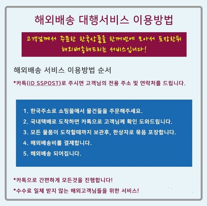 이용방법은 간단합니다. 우선 카카오톡으로 친구추가를 해주시고, 안내받으신 한국 주소지로 쇼핑후 상품을 보내주십니다. 물품이 도착하면 즉시 사진으로 확인시켜드리고 모든 물품이 도착하면 합배송 해드리고 있습니다.