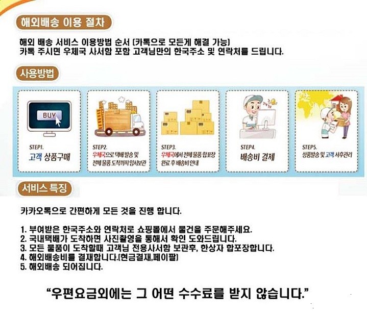 공신력있는 우체국 EMS 서비스를 이용하여 보내드리기때문에 신속하고 안전하게 받아보실수 있으시며, EMS 비용만 부담하시면 합포장, 물품보관, 송장작성등 전반적인 배송대행서비스를 무료로 제공받으실수 있으십니다.