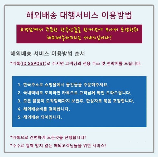 다년간의 배송경험을 토대로 안전하고 신속하게받으실수 있도록 공신력있는 우체국 EMS서비스를 이용해서 보내드리기 때문에 안전하게 받아보실수 있으시며, 수수료를 일체 받지않고 합포장 서비스까지 이용하실수 있으시므로 언제든지카카오톡 친구추가만 해주시고 문의 주시기바랍니다.
