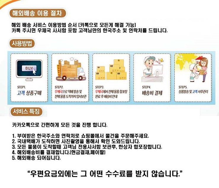 많은 고객님들께 다년간의 해외배송 경험과 노하우를 통해서 제휴우체국과 함께 카톡만으로 수수료 없이 해외배송대행,국제택배를 빠르고 안전하게 보내드리고 있습니다.