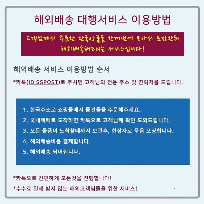 이용방법은 간단합니다. 카카오톡으로 친구추가 해주시고 안내받은 우체국 주소로 보내주기만 하시면 저희가 무료로 합포장하여 발송해 드립니다.